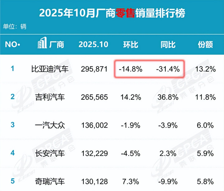 比亚迪连续三个月销量下滑,10月更是大跌31.4%,市场格局的变化速度远比想象中快。